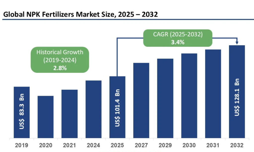 Мировой рынок NPK-удобрений, вероятно, достигнет стоимости в 101,4 млрд долл. США в 2025 году и, как ожидается, достигнет 128,1 млрд долл. США, демонстрируя среднегодовой темп роста (CAGR) в 3,4% в период с 2025 по 2032 год.