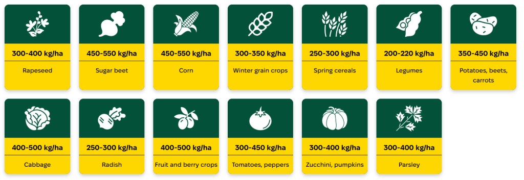 Потери аммиака при поверхностном внесении сульфата аммония не превышают 1–3%, тогда как потери карбамида и аммиачной селитры составляют 25–30% от внесённого количества азота. Важно также, что азот в сульфате аммония находится в наиболее доступной для растений форме и участвует в формировании урожая на протяжении всего вегетационного периода.
